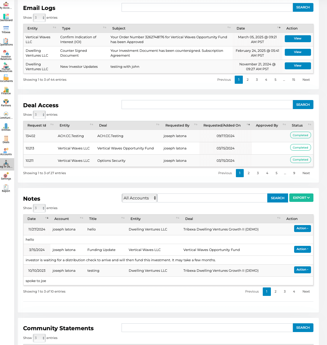 Tribexa was built with transparency and accountability in mind, ensuring you have complete visibility into every aspect of your deals and client relationships. With real-time activity tracking, version control and a single source of truth for all your documents and communications we have your built in “Activity Blotter” so you can confidently oversee your operations and safeguard your firm’s integrity. Tribexa’s robust compliance features also help you stay ahead of evolving regulations.